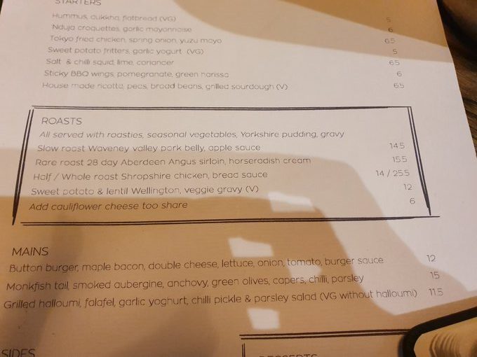 By this time at least half of Team Sunday Roast Club were annoyed enough to kick a hole through a van Gogh painting, so we went into the Button Factory, which had the virtue of being near, as well as the virtue of having been Vertu (which their contactless payment machine still thinks they’re called). And suddenly things started looking up. They were helpful, keen, led us to a table, told us about the menu. This is all rather nice. Music fractionally too loud, perhaps, but this is hardly the worst thing that can happen, and the decor’s pretty neat all in all. We ordered a bottle of a particular favourite white wine, which turned out to be the house white, and a beer, and they didn’t bat an eyelid at that (which is encouraging; bar staff, don’t be judgy). All was right with the world.