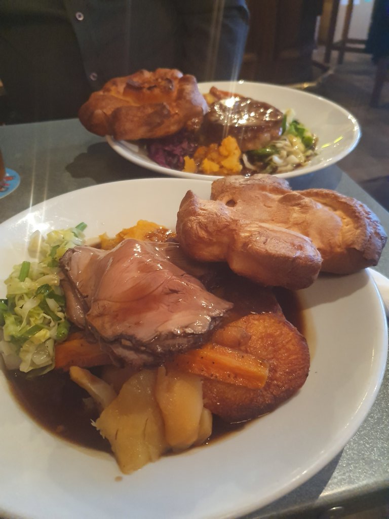 Here, a point must be brought up. Call us hide-bound traditionalists, but let the word go throughout the land: Yorkshire puddings go with beef. They do not go with everything. Did we miss a meeting or something? Did the restauranteurs of the world just decide “roasts = Yorkshires”? No! You don’t need to put one with every Sunday dinner, really you don’t. Especially ones as huge as these; now, it seems ill-tempered to complain about getting too much food, but if you’re going to do a substantial dinner and then add a huge Yorkshire cloud to it as well, it behooves you to at least supply bigger plates. At least they weren’t bowls.